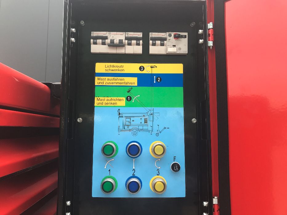 Scheinwerfer: Das Lichtmastaggregat wird mit 6 Halogen-Strahler je 1.500 Watt in Schutzart IP 67 geliefert. Die Leuchtmittel können je nach Kundenanforderung konfiguriert und entsprechend angepasst werden.