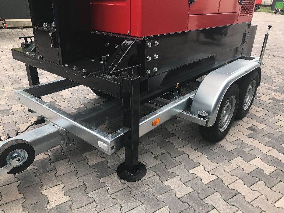Lichtmastanhänger bis 60 kVA: Mit einem zulässigen Gesamtgewicht von 2.500 KG bestehend aus zwei Gummifederachsen je 1.350 KG und Bereifung 185 R 14 C mit Stahlprofilrahmen, feuerverzinkt gefertigt. Zwei Stahlblechkotflügel, innen geschlossen. Optional Stufenlos höhenverstellbare Zugdeichsel (Knott KHD 25), 400 bis 1100 mm Anhängehöhe mit DIN LKW-Zugöse und Kugelkupplung für PKW. Beleuchtung nach StVZO in 12 Volt (optional 24 Volt) mit 13-poligem Stecker. Eine 100 km/h Zulassung ist gegen Aufpreis lieferbar.