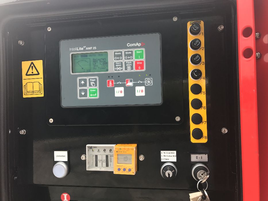 Ausstattung: Frequenzmesser, Betriebsstundenzähler (digital an der Steuerung), 1x Voltmeter mit 7-stelligem Umschalter und Drei-Amperemeter, 1x analoge Tankinhaltsanzeige, optische und akustische Alarmanzeige bei einer Funktionsstörung. Abgangsfeld für die gesamte Aggregateleistung