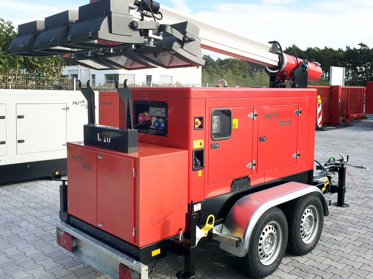 Unser Topmodell, bestehend aus Stromerzeuger und Lichtmastanhänger. Bereits das Grundmodell unseres mobilen Flutlichtaggregates bietet eine optimale Lösung, indem es alle Grundanforderungen für die Feuerwehr, THW, Polizei sowie Energieversorger im Bereich temporärer Stromversorgung in Kombination mit Flutlicht erfüllt.