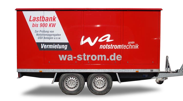 - Schnelle Verfügbarkeit z.B. 900 KW auf Zwei-Achs-Anhänger mit 2,6 Tonnen Gesamtgewicht